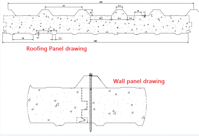 Advantage of this half automatic sandwich panel machines: it can either be used to make the EPS sandwich panels, PU sandwich panel and others:  EPS Sandwich Roof Panels are composed of 3 layers, the external and internal is two dyed Galvanized or Aluminum corrugated plates, and core high density EPS foam. Thanks to their properties the panels may be applied in object that require very high fire resistance, EPS sandwich panel is the most effective acoustic materials used on construction. Here I take a random drawing profile for your reference: