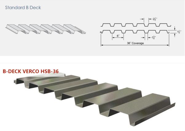 B Deck is by far the most commonly used roof deck for new construction projects. This is due to the fact that B deck is the most efficient 1.5”deep steel roof deck section. Compared to Type A roof decks and Type F roof decks, Type B metal roof decks have the highest strength-to-weight ratio. As with all steel products, the lighter the section, the more economical it will be. And since Type B roof decks can carry higher loads at longer spans than A decks and F decks, the steel supports below the metal deck can be spaced further apart. The result? A larger support spacing results in fewer supports and more savings for the building owner.