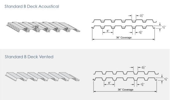 Type B, wide-rib structural roof deck is a high-performance, cost-efficient choice with a variety of options to meet multiple project needs. Standard or cellular, acoustic or vented, interlocking or nested side laps, B deck is among the most flexible of our 1½-inch deep roof decks.